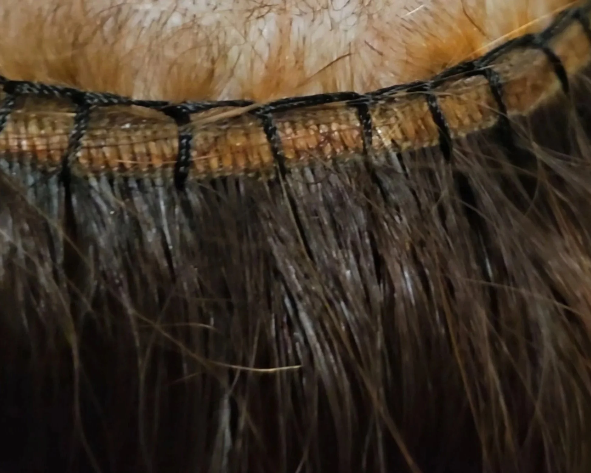 Step 3: Hair weft is snuggly sewn into the beaded row.